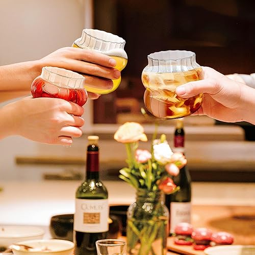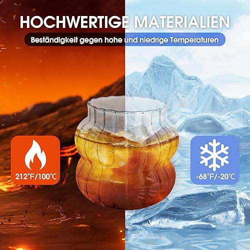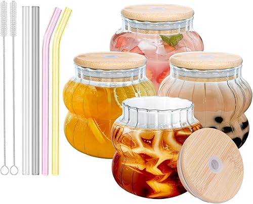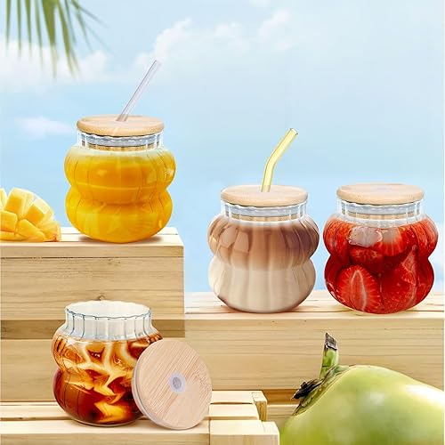 4 verres en verre avec des pailles colorées et des couvercles, 410 ml, esthétiques, verres à café glacé, verres à bulles ondulés, verres à bière pour cocktails et sodas, avec brosse offerte.