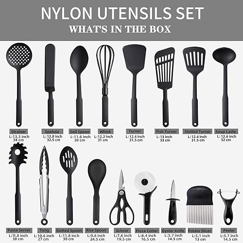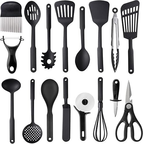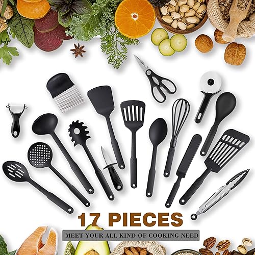 Ustensiles de Cuisine, TJ POP 17PCS Nylon Cooking Utensils Set, 410F° Heat Resistant & Non-stick Food Nylon Kitchen Gadgets Accessories For Cookware, BPA Free Kitchen Tools (Black)