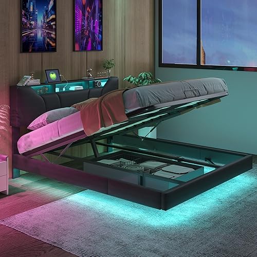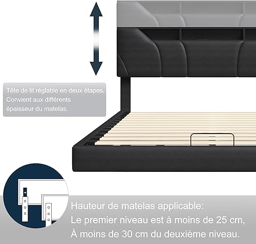 Lit Double Moderne Suspendu avec Tête,Prise Intégrée et Éclairage LED Commande par Télécommande/APP, 160 x 200 avec Sommier(Noir)
