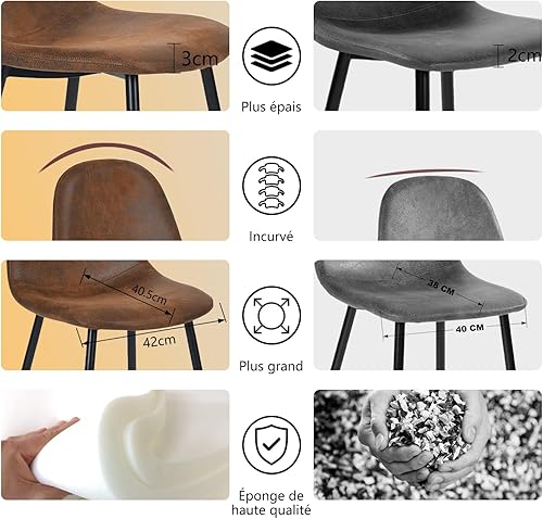 MEUBLE COSY Lot de 4 chaises de salle à manger Scandinave Fauteuil Salon Cuisine Pied Métal Noir Rétro Vintage en suédine Marron