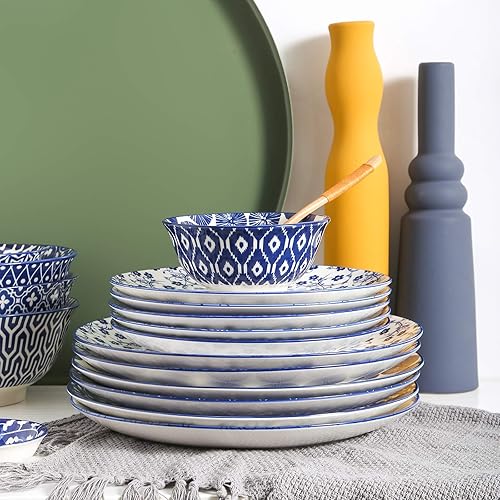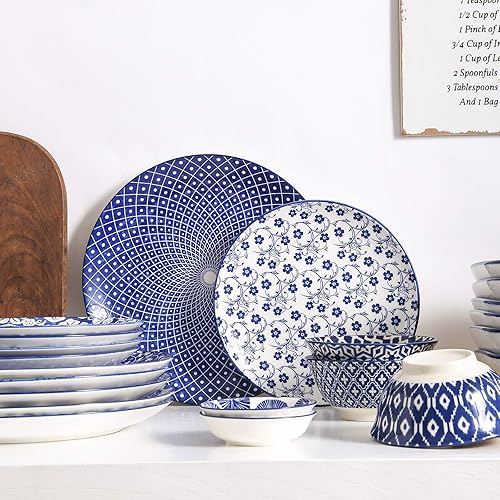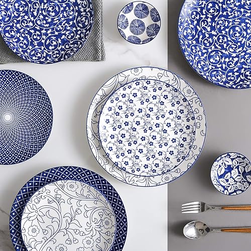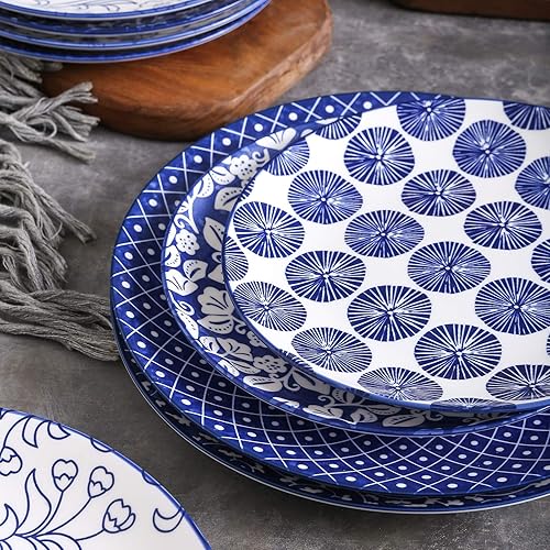 Selamica Lot de 6 grandes assiettes en porcelaine de 25,4 cm pour salade, crêpes, résistantes aux rayures, passent au micro-ondes, au four et au lave-vaisselle, bleu vintage