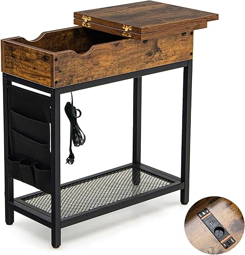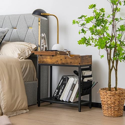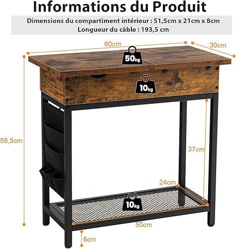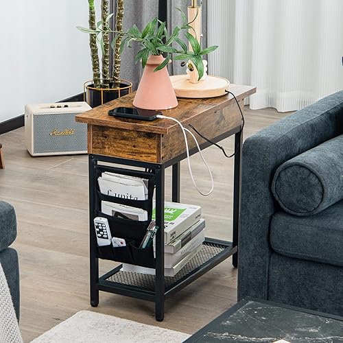 COSTWAY Bout de Canapé avec Prise, Table d’Appoint Rabattable, 1 Ports USB, 1 Type-C, Pochette en Tissu Amovible, Étagères en Treillis Métallique, Table de Chevet pour Salon Chambre, 60x30x58,5cm