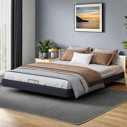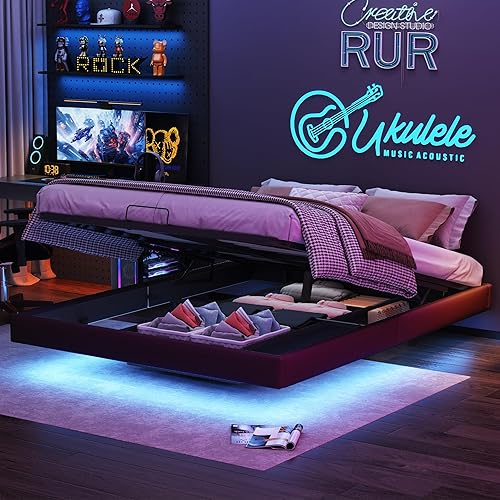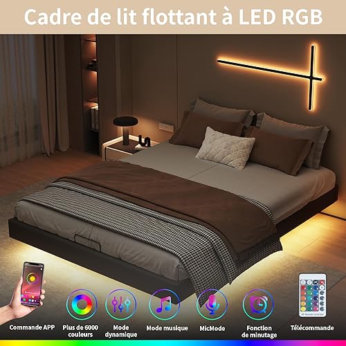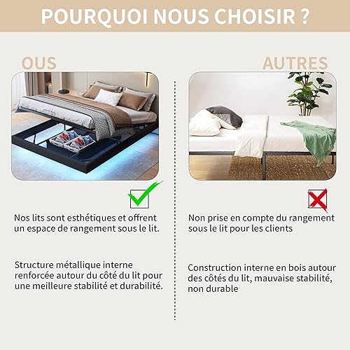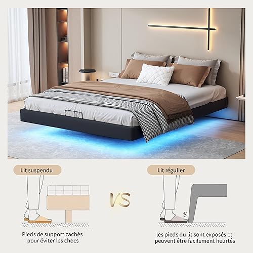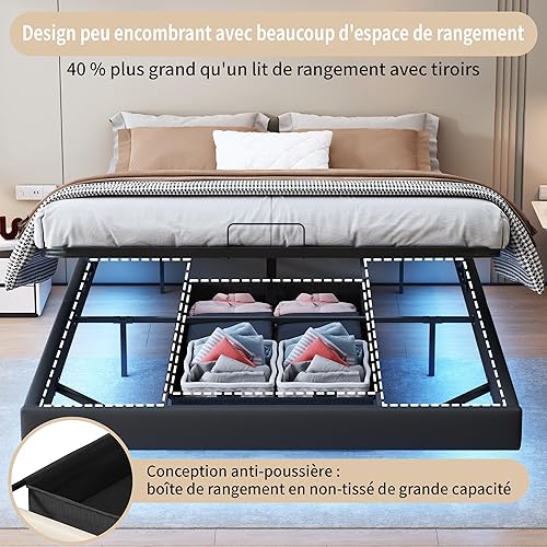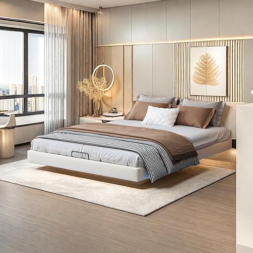 KRYZOR Lit Flottant 160x200 cm, Lit Double rembourré avec Rangement et LED, Lits Coffre hydraulique, Lits Plateforme, avec Sommier à Lattes en Bois, Structure Métallique, PU (Beige)