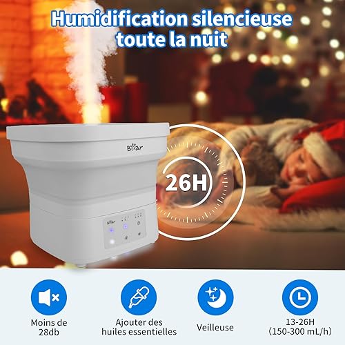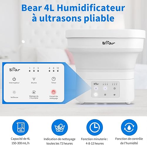 Bear Pliable 4L Portable Humidificateur, Avec Plateau Diffuseur D'arômes, Buse 360° Avec Lumière De Nuit, Minuterie Arrêt Automatique, 28db Ultra Silencieux, Pour Les Bébés Et Les Plantes