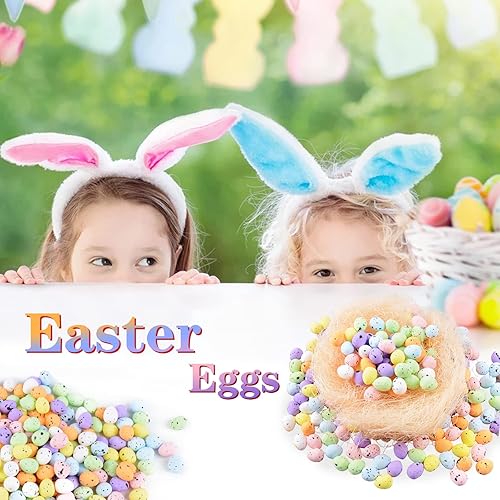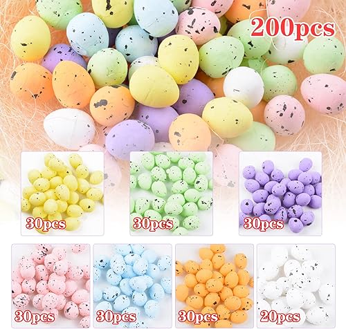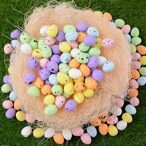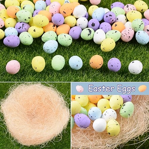 BETESSIN 200Pcs Oeufs Colorés Mousse de Pâques Easter Décorations avec Poulailler Artificielle Nid Chanvre Sisal Mini Oeufs Mouchetés Ornements de Jardin Bricolage Décoration de Pâques