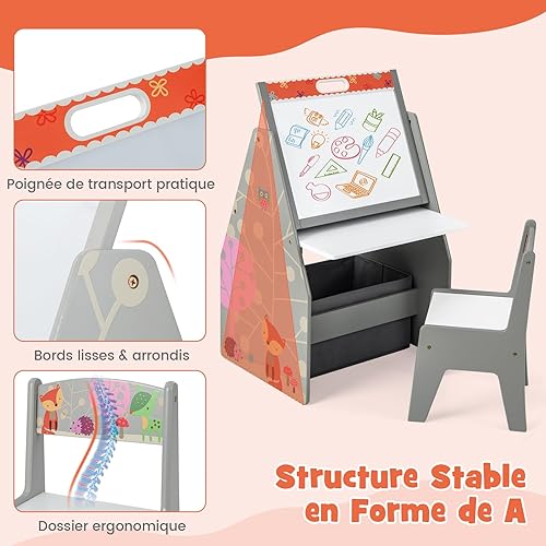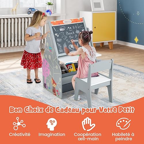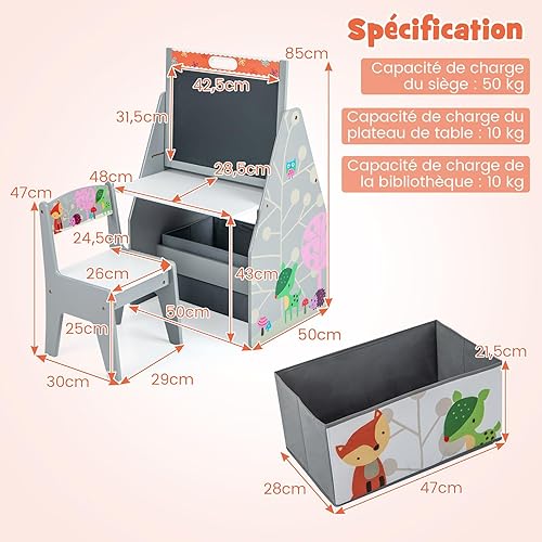 COSTWAY 3 en 1 Table Enfants avec Chaise et Tableau Double Face & Réglable, Table à Dessin avec Bac en Tissu & Motif d'animaux, Bibliothèque pour Jouets Livres, Charge 50/10kg(Gris)