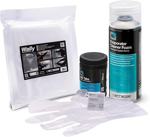 ERRECOM Kit nettoyage climatisation, contient Evaporator Cleaner Foam Nettoyant moussant climatiseur, housse de protection Wally, A/C Tabs 40 tablettes pour climatiseur à action prolongée, gants