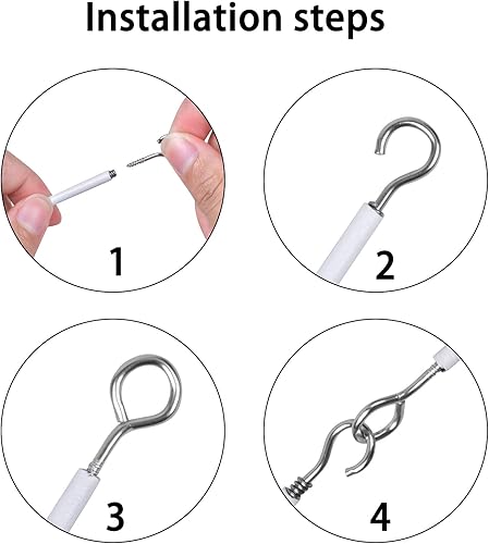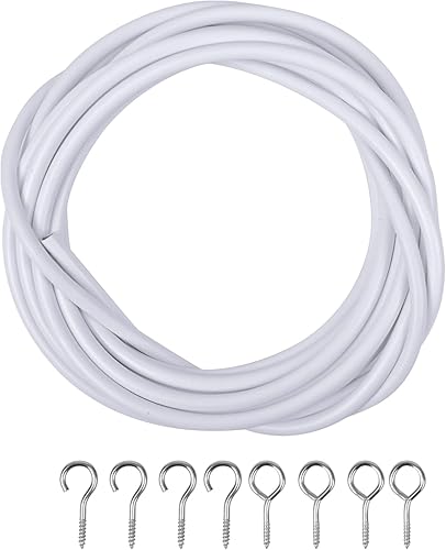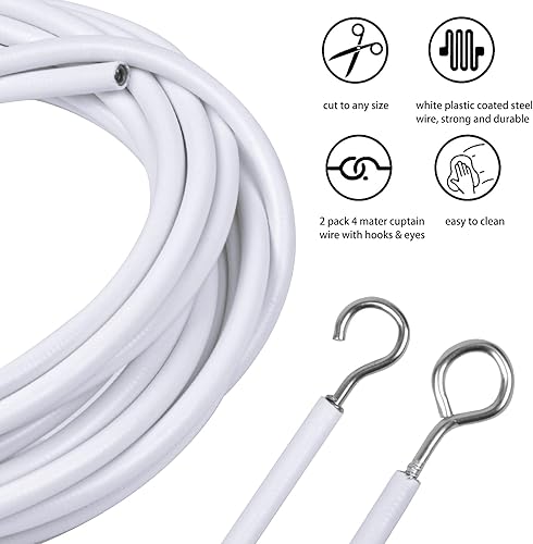 smatime 3M Câble de Rideau Fil de Rideau Blanc avec 4 Paires Piton à Visser Boulons à Oeil et Crochets à Visser Fil de Rideau Corde Câble à Rideau Enduite de Plastique pour Rideau Tringles à Rideaux