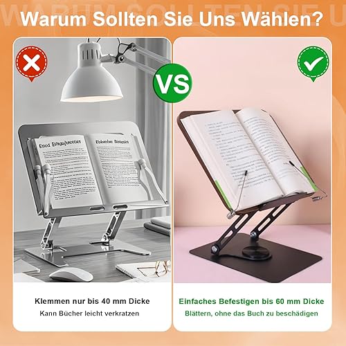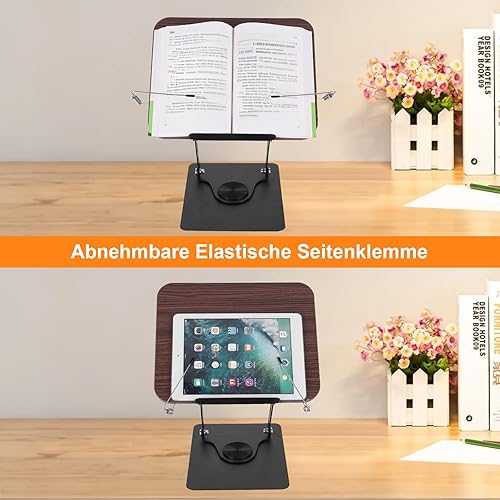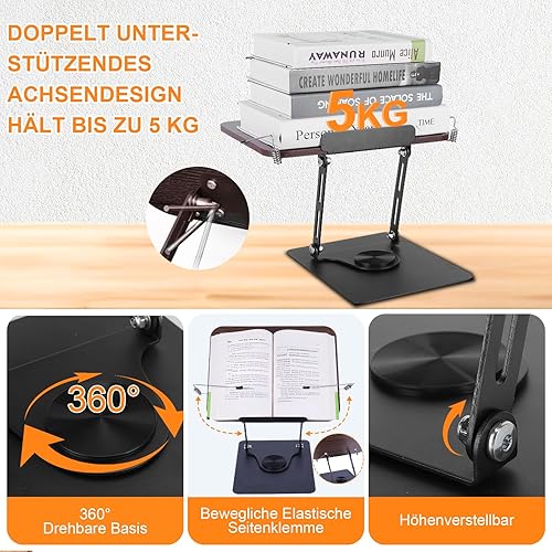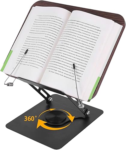 Support de Livre pour Lecture, Hauteur Réglable porte Livre Ergonomique, Base Pivotante à 360°, Pupitre de Lecture avec Clips Élastiques pour Pages