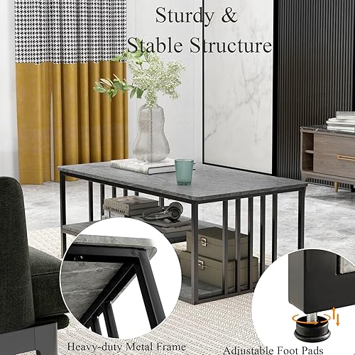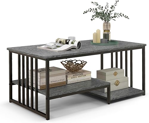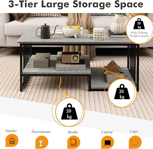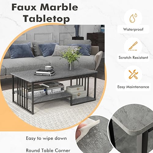 LIFEZEAL Table Basse avec Effet de Marbre, Table de Salon en Bois+Métal, Design Moderne, 110 x 60 x 45 CM, Max 90 kg, Gris