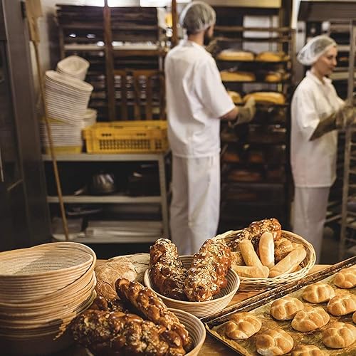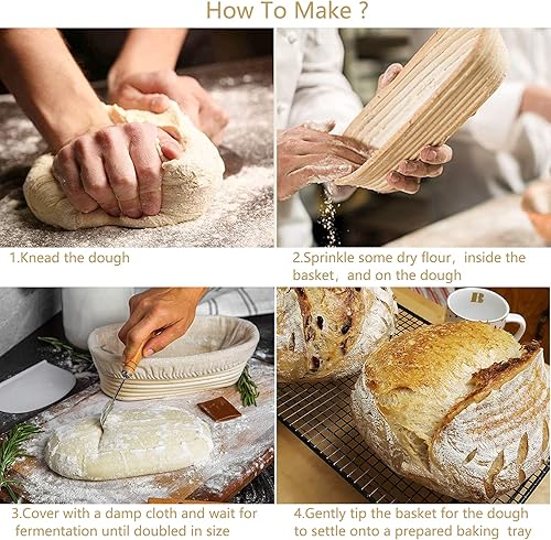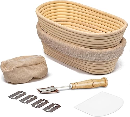 Wumu Lot de 2 paniers de fermentation ovales de 25,4 cm en osier naturel pour boulangers professionnels (avec insert en lin, spatule, pain)