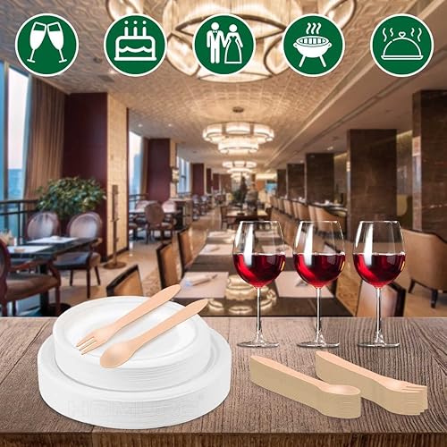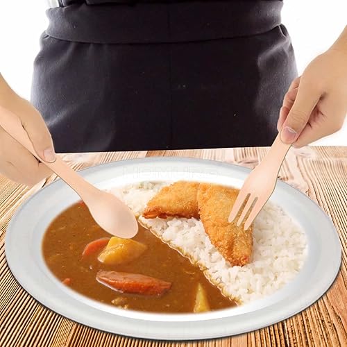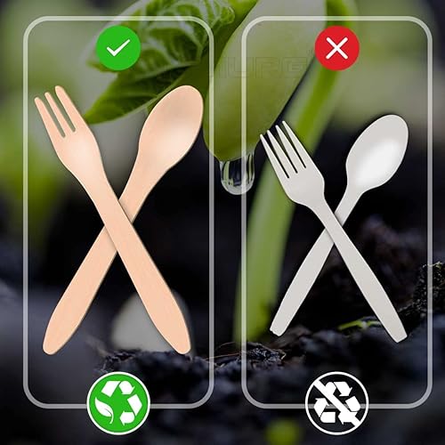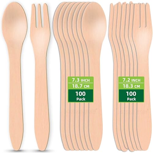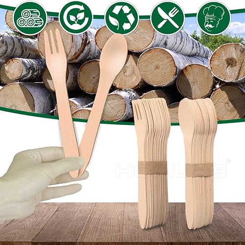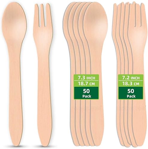 HOMURG Lot de 100 cuillères et fourchettes jetables en bois pour 50 invités, couverts de fête respectueux de l'environnement avec 50 fourchettes en bois + 50 cuillères 50 pièces, couverts en bois de