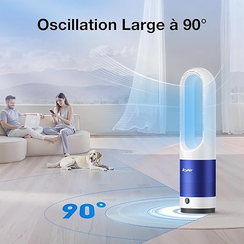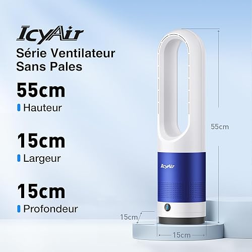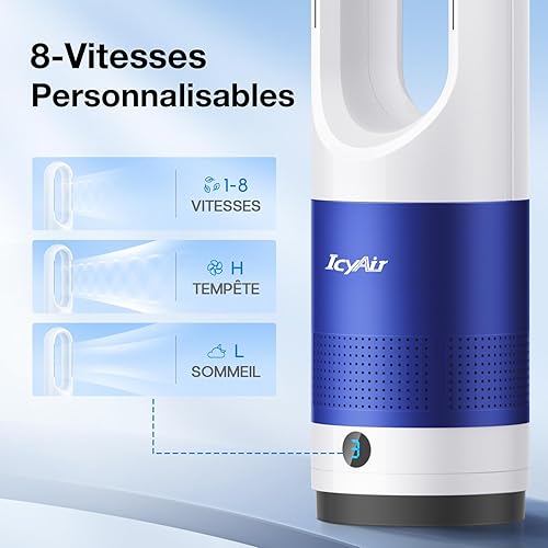 IcyAir Ventilateur Sans Pale, Ventilateur Colonne Silencieux avec Télécommande, 8 Vitesses, Oscillation à 90°, Minuterie 9 Heures, Affichage LED, Ventilateur Tour pour Chambre, Bureau