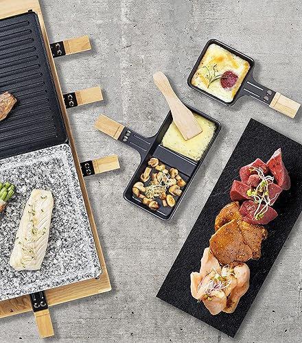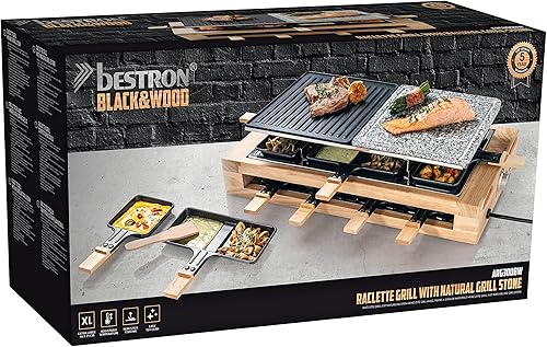 Bestron Raclette grill XL, appareil à raclette électrique jusqu'à 8 personnes avec pierre naturelle et plaque de grill à revêtement antiadhésif, livré avec un grand set de poêlons, Couleur: Bois