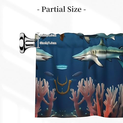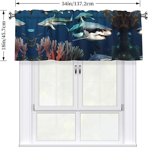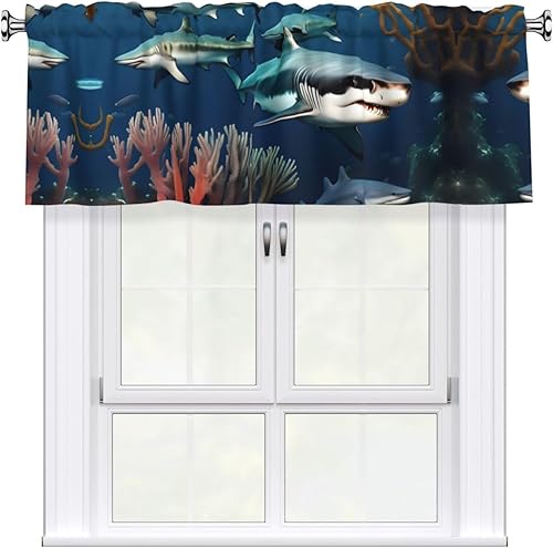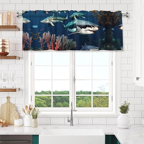 AEKGOHP Rideaux courts avec tringle à cantonnière - 137,2 x 45,7 cm - Motif requins sous la mer - Pour cuisine, salle de bain, buanderie, studio - S'adapte à la plupart des tringles à rideaux standard