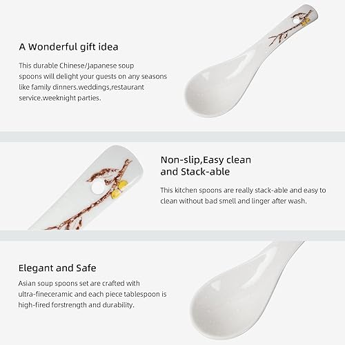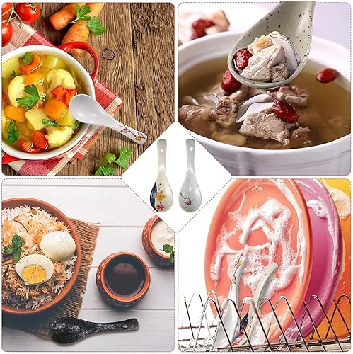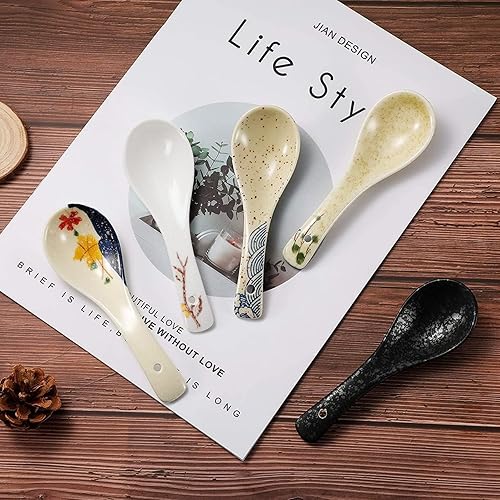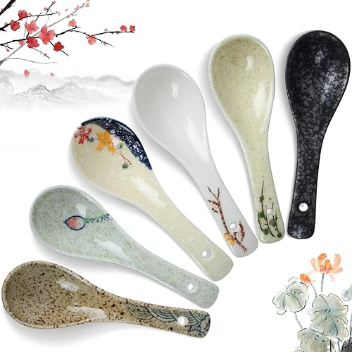 Lot de 6 cuillères à soupe japonaises rétro en céramique - Cuillères à soupe asiatiques de style japonais - Cuillère à riz - Couverts de service chinois - Apéritifs - Vaisselle de repas pour salade,
