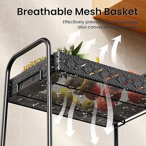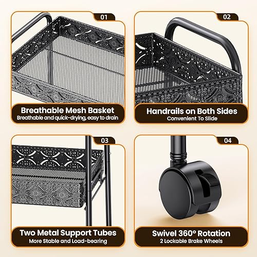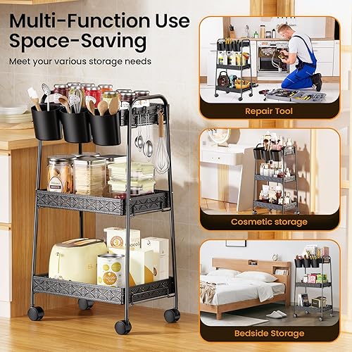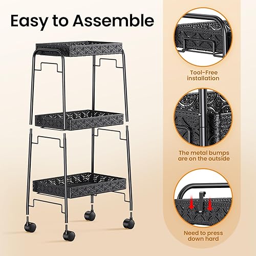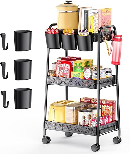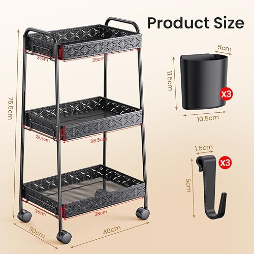 PKBD Chariot de Rangement Mobile à 3 Niveaux, Métal Desserte à roulettes avec 3 Paniers Suspendus et 3 Crochets, Chariot à roulettes, Desserte Cuisine Rangement, pour Chambre, Cuisine, Noir