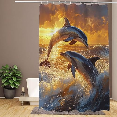 Rideau Douche 120x200 cm Extra Long Rideau de Douche Dauphin Anti Moisissure Imperméable Tissu Polyester Facile À Nettoyer Shower Curtain avec 12 Crochets, Decoration Maison, Coucher de Soleil R-160
