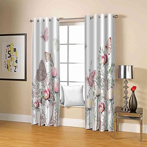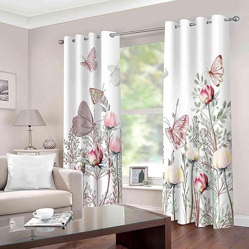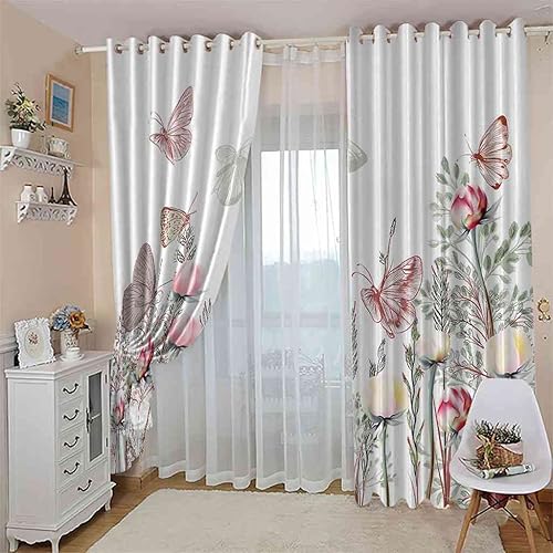 YIJOY Rideaux Occultant pour Chambre À Coucher Salon Cuisine Oeillets Isolation Thermique Rideau Papillon Fleur Rose Polyester Rideau Fenêtre 183x214cm, 2 Panneaux