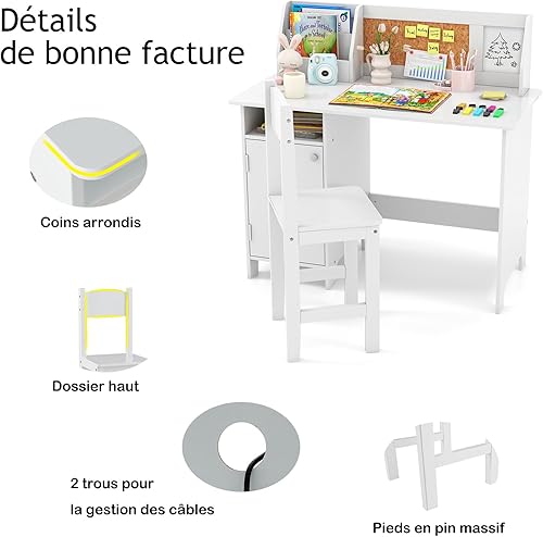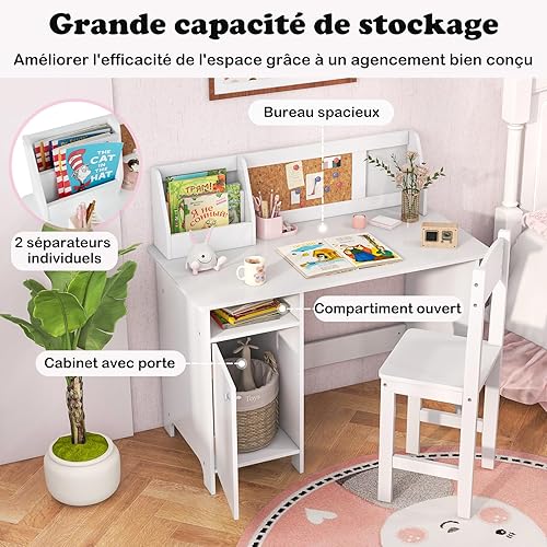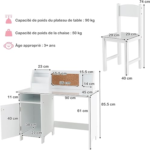 LIFEZEAL Bureau Enfant avec Rangement et Chaise en Bois, Table d’Etude avec Cabinet, Compartiment, Tableu Blanc, Bureau Primaire Blanc 90x45x86cm, Charge 90/50kg, Garçon Fille 3-10 Ans