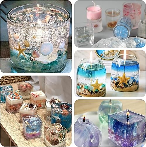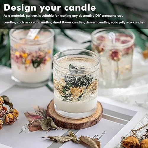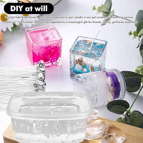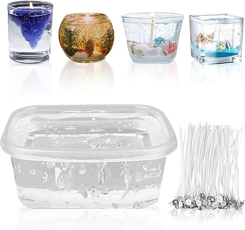 LEKEFETO 500 g de cire gelée : gel de bougie avec 50 mèches de bougie, cire gelée transparente, bricolage, cire gel de qualité supérieure pour la fabrication de bougies et l'artisanat, bougies en cire