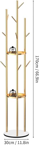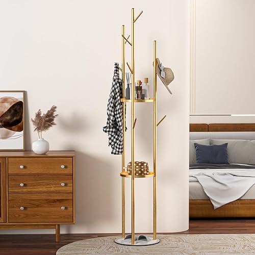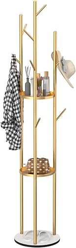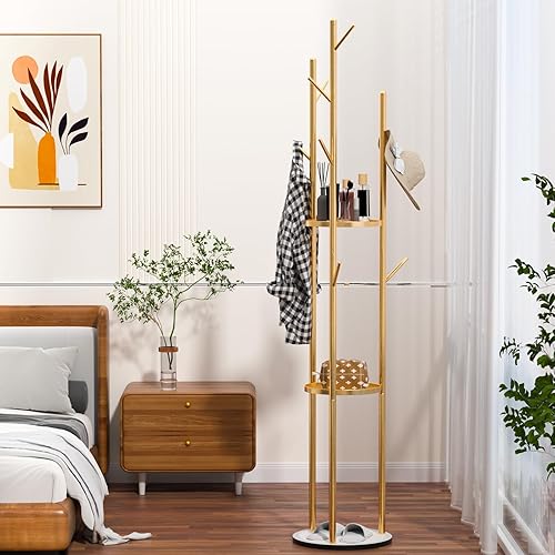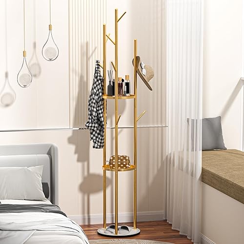 funrautz Porte-manteau sur pied avec étagères de rangement et crochets, porte-manteau vertical pour vêtements, chapeaux, sacs, veste, pour salon, chambre, maison, bureau - Doré