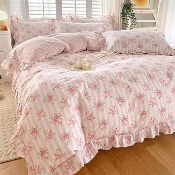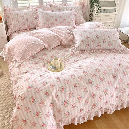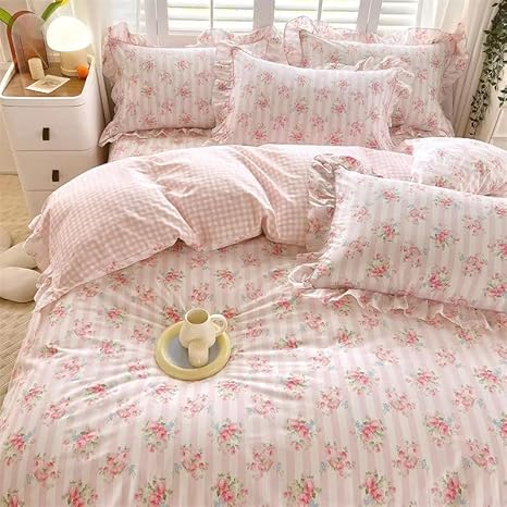 Housse de Couette à Volants, Imprimé Floral Rose pour Filles Parure de Lit 200x230 Style Princesse à Volants et Fleurs Motif Rayures et Grilles Mignon Housse de Couette pour Femme Décoration de C