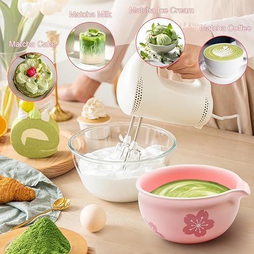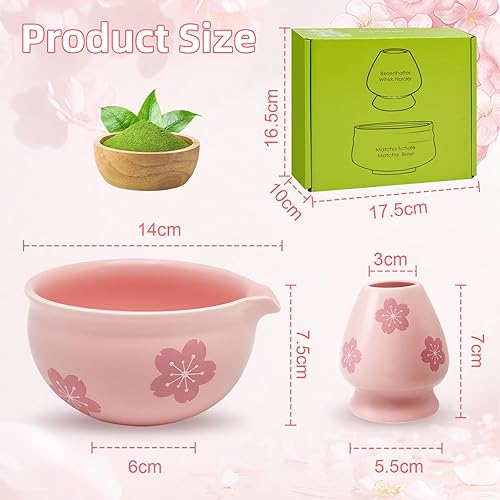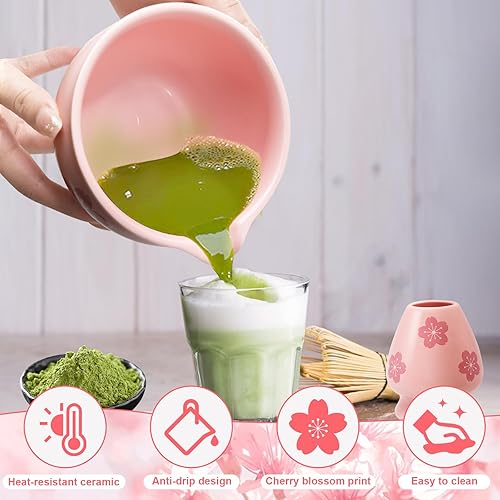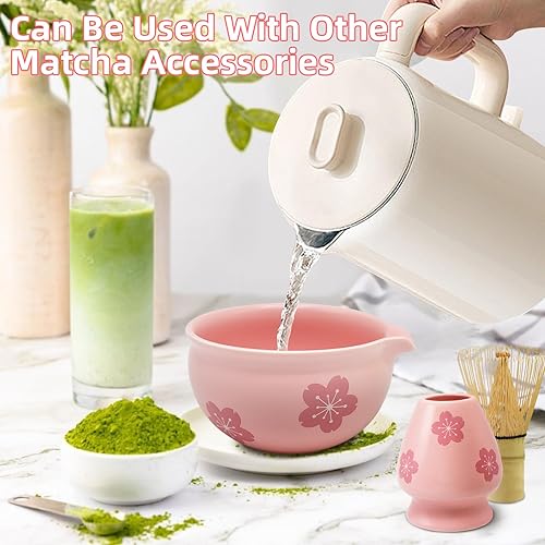 Cyiecw Lot de 2 bols à matcha rose Sakura - En céramique - Avec bec verseur et porte-balai - Pour la préparation de thé Ursi, Koicha et Matcha