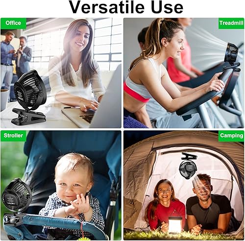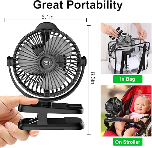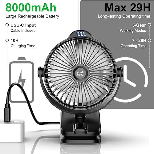 Minthouz Ventilateur Portable USB, Ventilateur Bureau Silencieux avec Clip, Batterie 8000mAh Rechargeable, 5 Vitesses, Idéal pour Camping, Poussette, Maison, Bureau