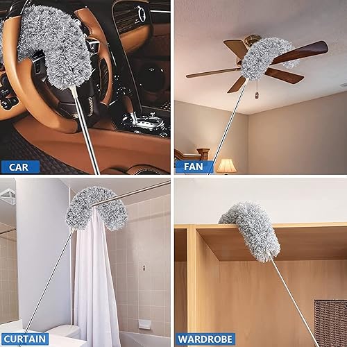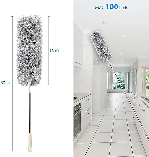 Duster en Microfibre pour Nettoyage avec Tige d'extension (Acier Inoxydable) atteint 100 Pouces, Flexible et Extensible pour Nettoyer Ventilateur de Plafond, Meubles, Clavier/Voitures