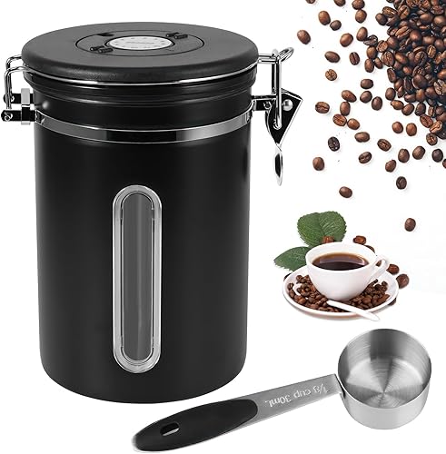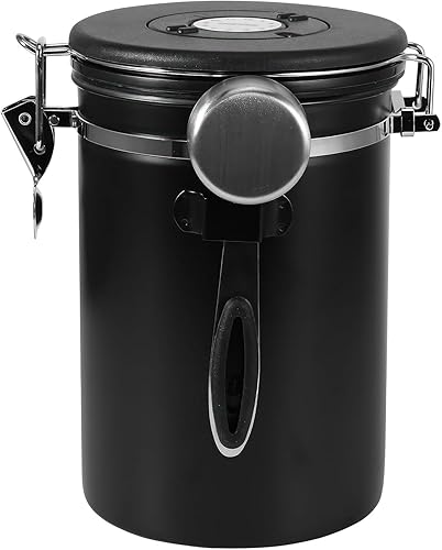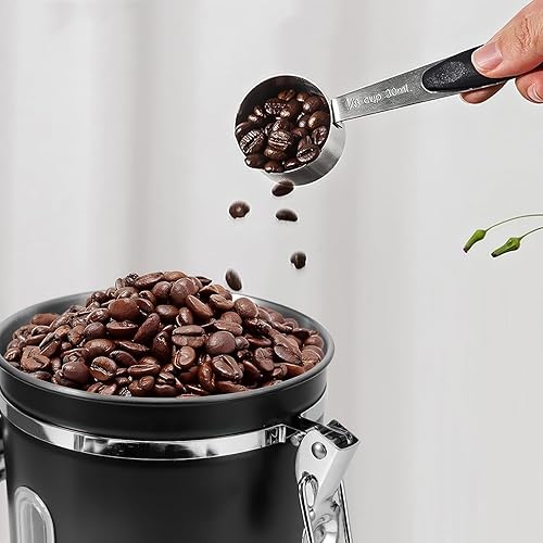 ZONJIE Boîte à café hermétique - 1,8 l - En acier inoxydable - Avec cuillère doseuse, valve CO2 et date - Pour café moulu et grains de café moulu - Noir