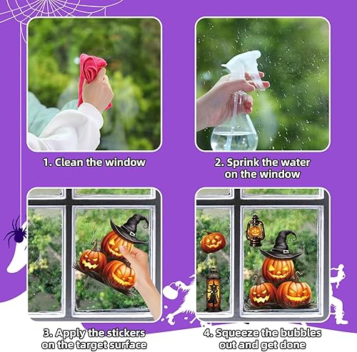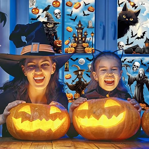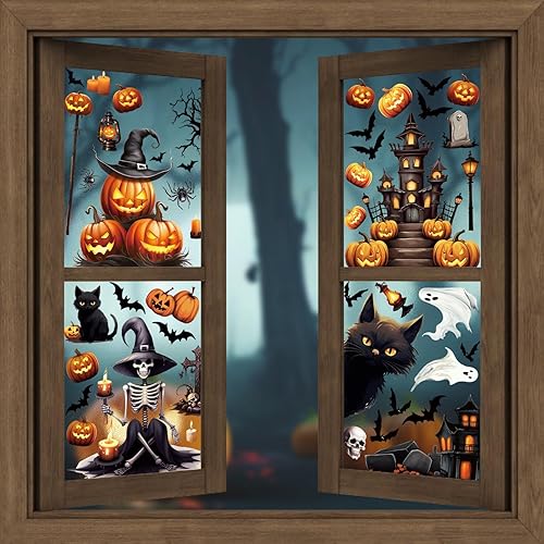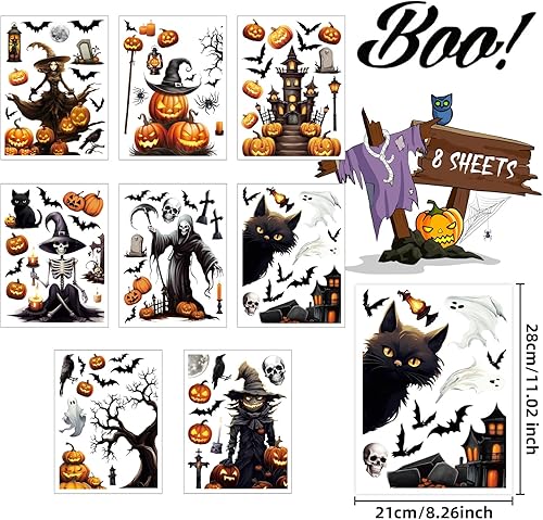 ZALAON Autocollants de fenêtre d'Halloween, 21 x 28 cm, squelette, citrouille, château, sorcière, autocollants de décoration pour fournitures d'Halloween (8 feuilles), DM551M2P1