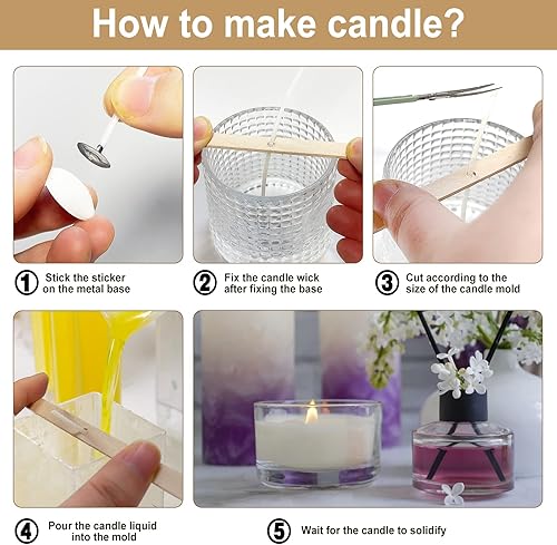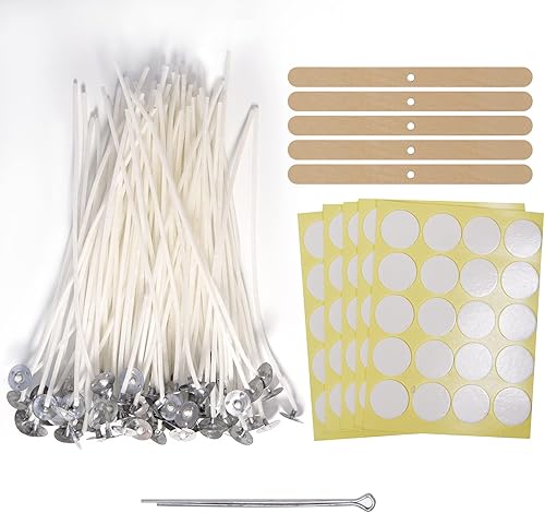 100 Pcs Mèche Bougie 15cm + Autocollants Mèche de Bougie + Support de Mèche de Bougie + Base en Métal + Clip de Mèche, Mèche Bougie Pré Ciré, Meche Bougie Coton, pour Fabrication de Bougie, Bricolage