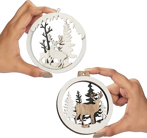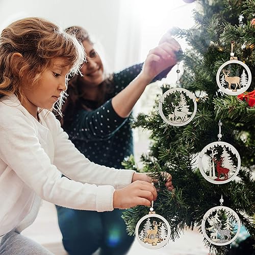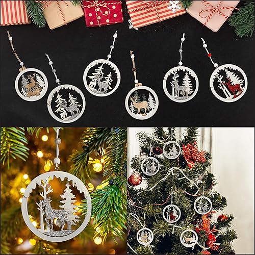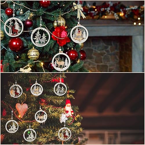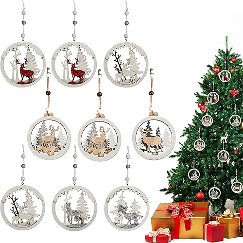 BELLE VOUS Suspension Sapin de Noël en Bois (9 Pcs) - Décoration Sapin de Noel Découpé au Laser Sculpture avec Ficelle pour Décoration de Noel - Boule de Noel en Bois pour Décorations de Fêtes