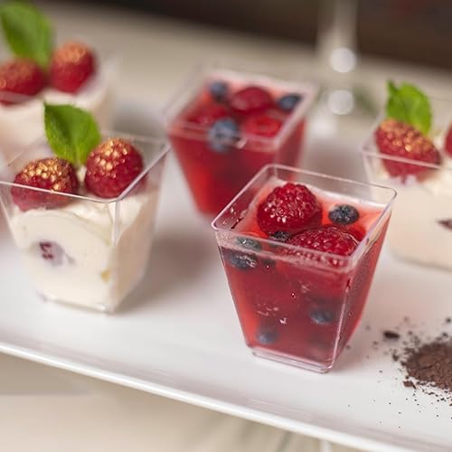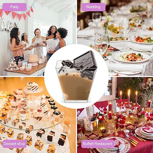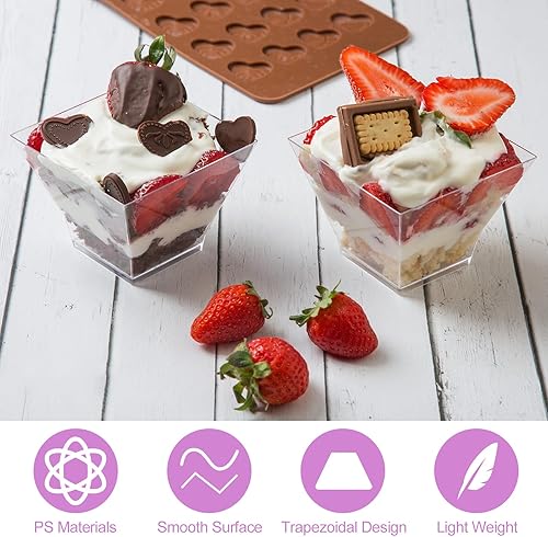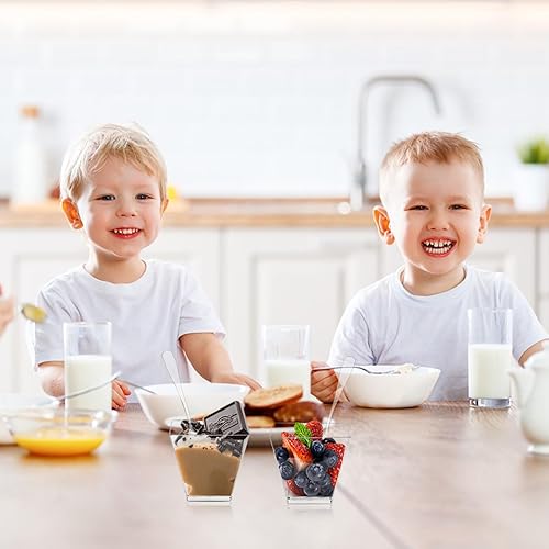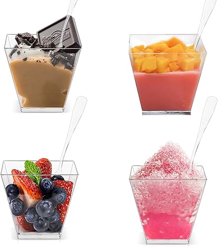 Fousenuk 2oz/60 ml tasses coupes gobelets à dessert avec cuillères plastique,50 pièces verrines à dessert réutilisables transparents Carrés pour pudding, mousse, crème glacée, anniversaire, mariages