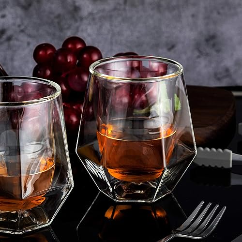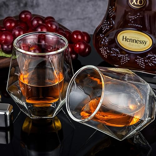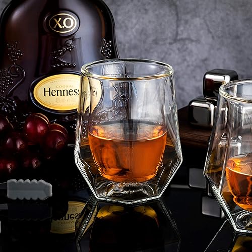YouYah Set de 2 Verres à Whisky - Verre à Whisky Cristal Double-Paroi avec 4 Glaçons en Acier Inoxydable & Pince, Verre de Dégustation, Cadeau pour Homme, Verre de Bar pour Cocktail, Cognac (200ml)