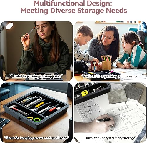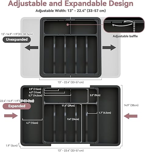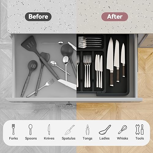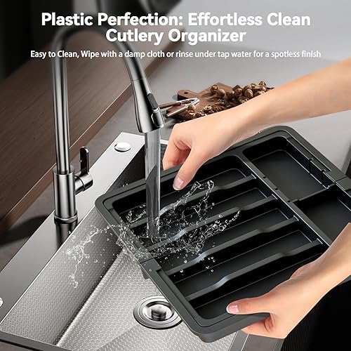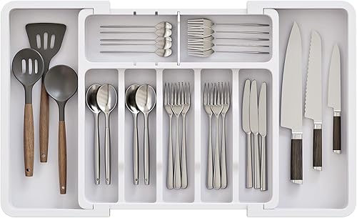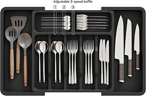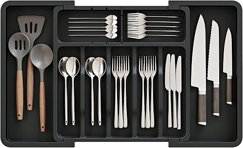 ABHENG Range Couverts, Organisateur d'ustensiles, Tiroir pour Ustensiles de Cuisine Extensible et Réglable, Porte-couteaux en plastique avec multiples compartiments,cuillères,fourchettes,Gris,AFD011G