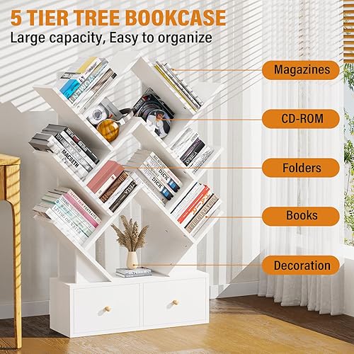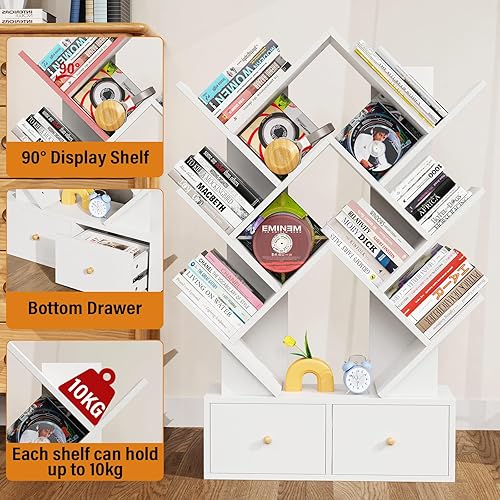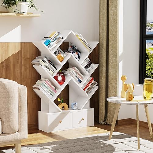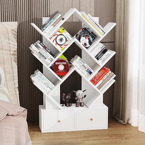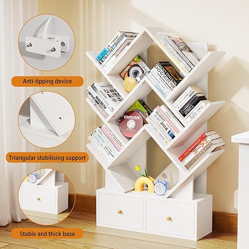 Lvhcmfohm Bibliothèque en Forme Arbre avec 9 Niveaux & 2 Tiroirs – Étagère Murale Gain de Place pour Salon, Coin Moderne en Bois E1, 9 Cases Ouvertes et Rangement Élégant