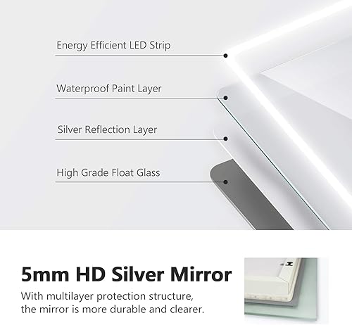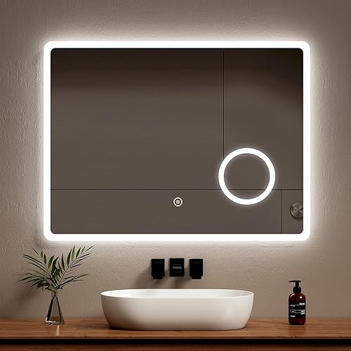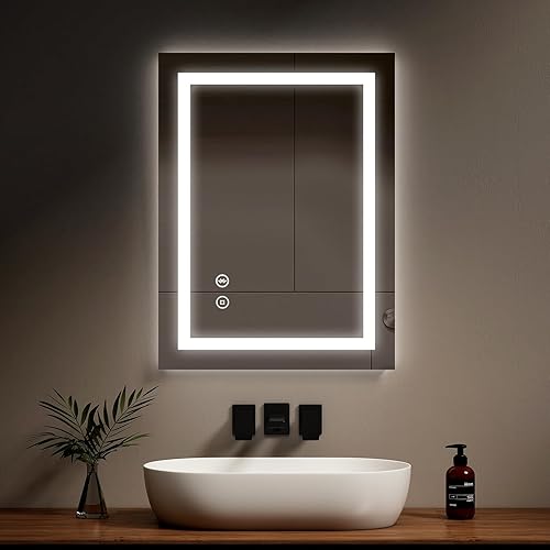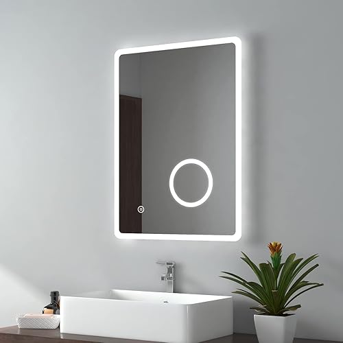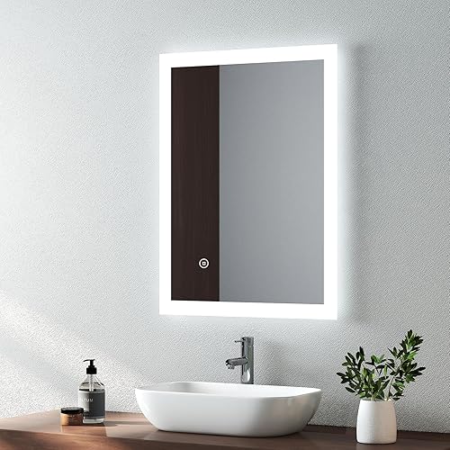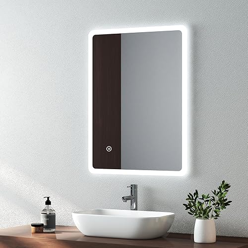 EMKE Miroir de Salle de Bain Bluetooth avec Prise Rasoir, 450 x 600 mm, Bleu atmosphère, Miroir Lumineux de Salle de Bain avec 3 Tons de Couleur, intensité Variable, Fonction mémoire, désembuage