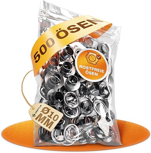 CRAFTUS® Lot de 500 œillets en acier inoxydable - 100 % inoxydable - Diamètre intérieur : 10 mm - Compatible avec toutes les pinces à œillets CRAFTUS - Œillets pour bâches, bannières, rideaux, etc.