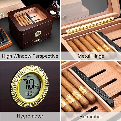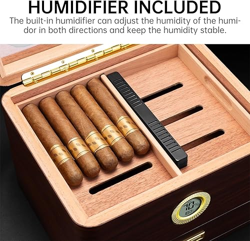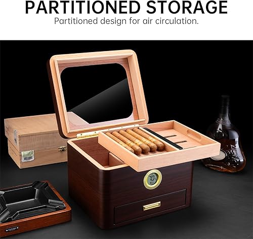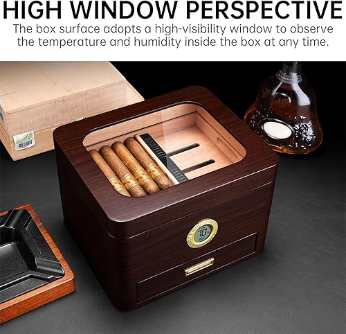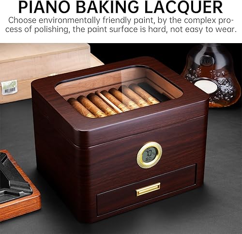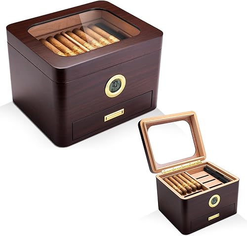CIGARLOONG Cave à cigares avec Couche et humidificateur et hygromètre intégré et tiroir pour 65 cigares, Cave à cigares de Bureau avec Dessus en Verre pour Les Amateurs de cigares