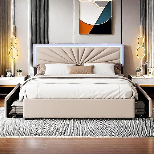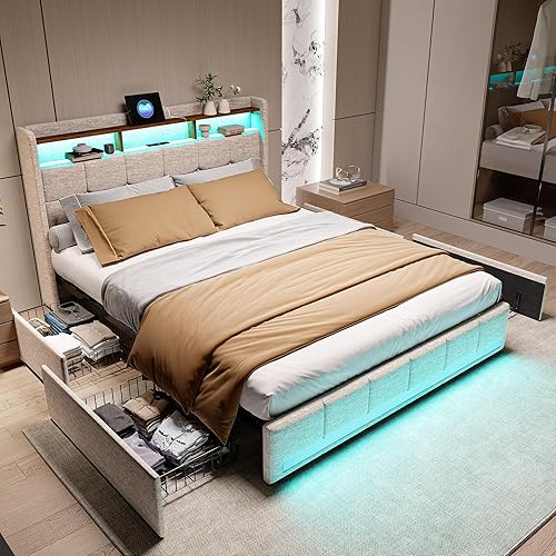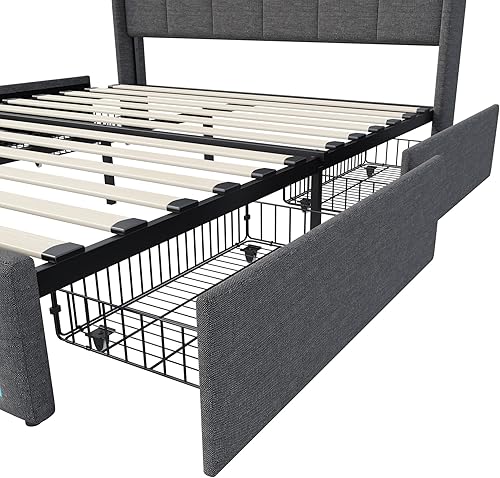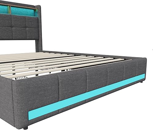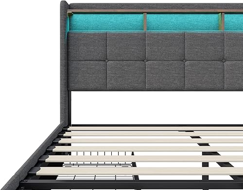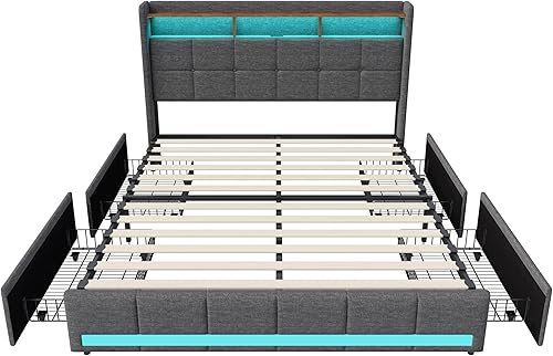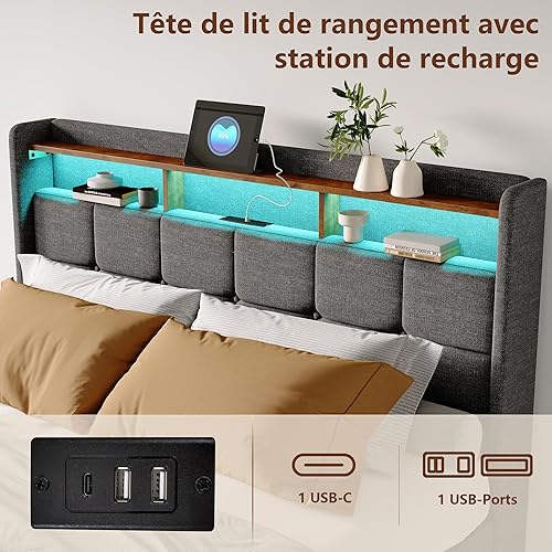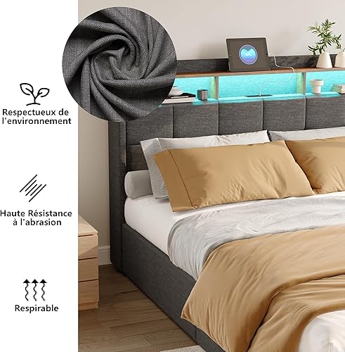 KOOPMAD Lit Double 160x200cm,lit Double Capitonné avec Éclairage LED et Charge USB,Tete de Lit avec Rangement,LIT Adulte 160x200cm,4 Tiroirs,Lin, Gris(sans Matelas)