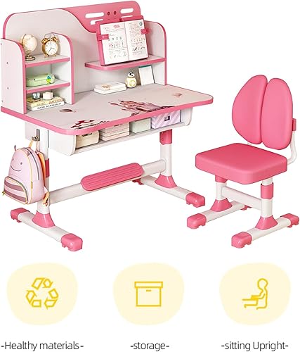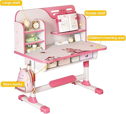 cukoekim Ensemble de chaises de bureau réglables pour enfants, table d'étude, bureau d'apprentissage à domicile avec chaise ergonomique avec motif dessin animé, bibliothèque et tiroir (rose)