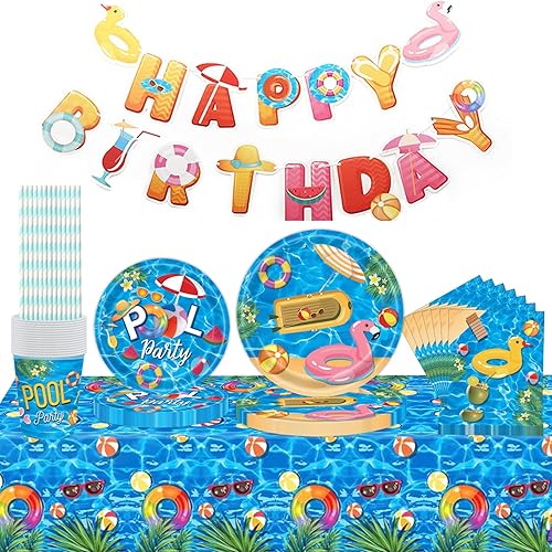 Ensemble de 72 pièces de vaisselle pour fête de piscine, fournitures de décoration de fête sur le thème de la plage, comprenant assiettes, tasses, serviettes, nappe, bannière, flamant rose hawaïen