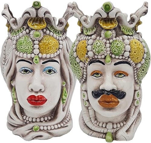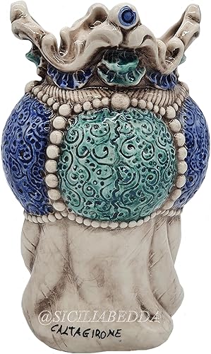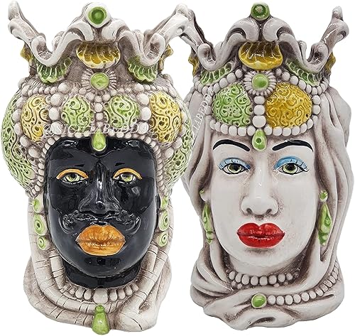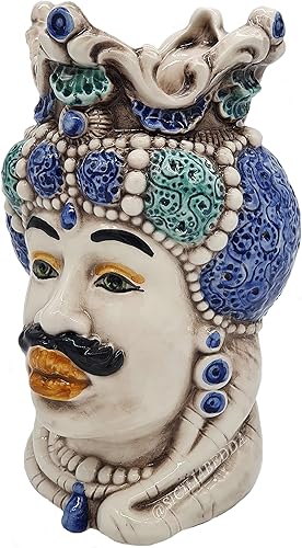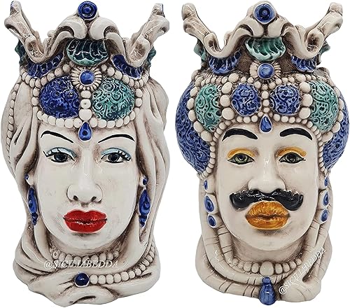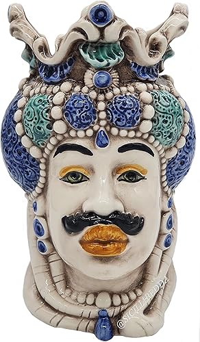 sicilia bedda - Têtes de Moro Siciliennes en céramique de Caltagirone - entièrement à la main - Hauteur 18 cm (paire de têtes de mort bleu)
