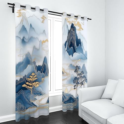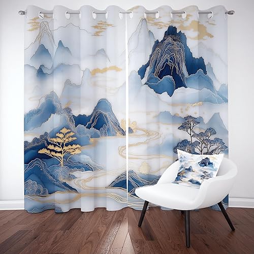 Sobhdga Paysage Naturel Montagne Aquarelle Rideau Thermique Isolant Anti Froid, Rideaux Style Chinois Opaque Occultant pour Chambre, Draperies Interieurs a Oeillets 140l X 260h, Lot de 2