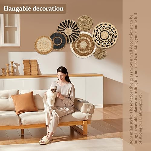 QINGLANG Lot de 7 paniers muraux bohèmes tissés à la main en rotin - Décoration murale ronde à suspendre - Motif géométrique bohème - Pour salon, bureau, chambre à coucher
