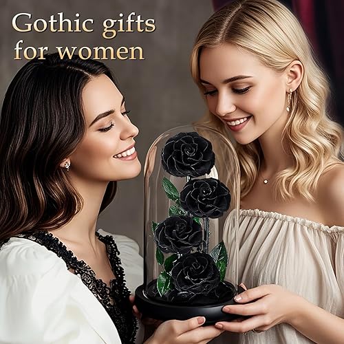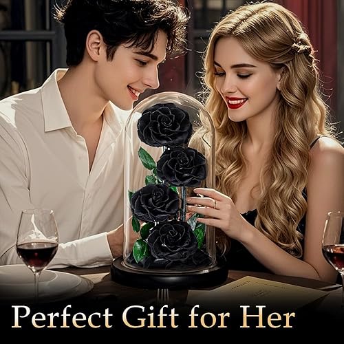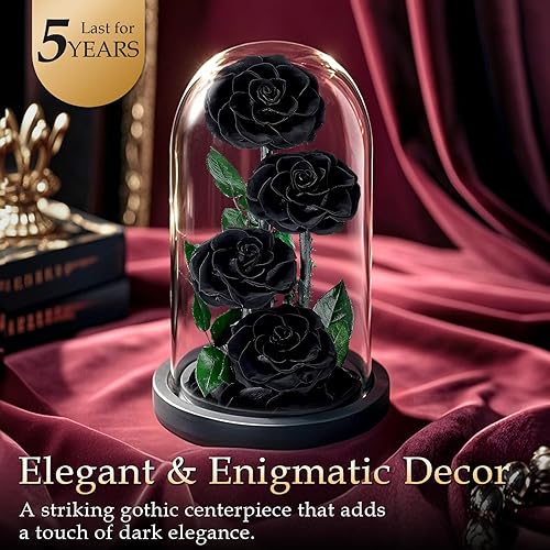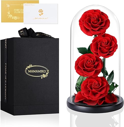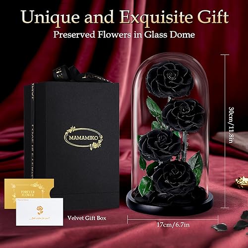 MAMAMIKO 4 Rose Eternelle sous Cloche, Fleur Eternelle Cadeau, Idée Boite Rose Eternel, Cadeau Fête des Mères, St-Valentin, Noël, Anniversaire, Femme, Copine, Amie, Mere, Grand Mere(Rose Noir)