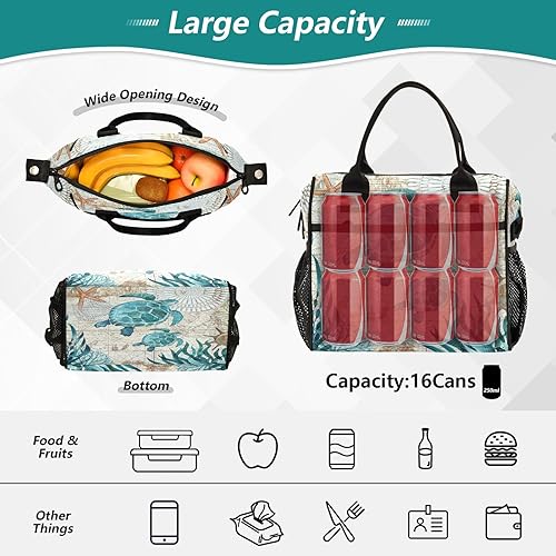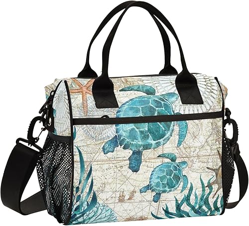 Mnsruu Grand sac à déjeuner isotherme, vintage, tortue de mer, étoile de mer, carte de mer, boîte à déjeuner réutilisable pour bureau, travail, école, pique-nique, plage, sac fourre-tout avec sangle