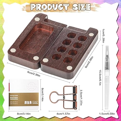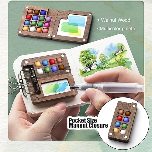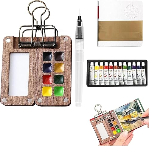Mini kit de peinture aquarelle de voyage, palette portable avec 8 grilles, ensemble d'aquarelle de poche de voyage avec clip en métal, palette de peinture aquarelle 12 couleurs avec stylo